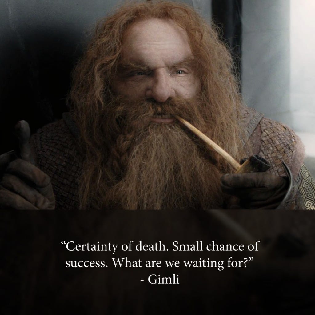 You have no idea how much of a good time we are having. Being scared, nervous, hopeful but creative at the same time? That’s priceless! It reminds me of the before-battle scene below from the Lord of the Rings.
